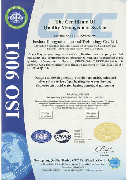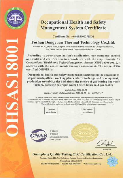 ISO9001, ISO14001 및 OHSAS18001 증명서, 우리의 보일러 및 온수기를 얻는 DONGYUAN 성공은 CU-TR 증명서의 요구에 따르고 유럽 기준은 러시아, 이란, 아제르바이잔, 우즈베키스탄, 이스라엘 및 다른 유럽 시장 및 Southest 아시아 시장에서, 뜨거운 판매, 특히 전 세계 안으로 만듭니다.